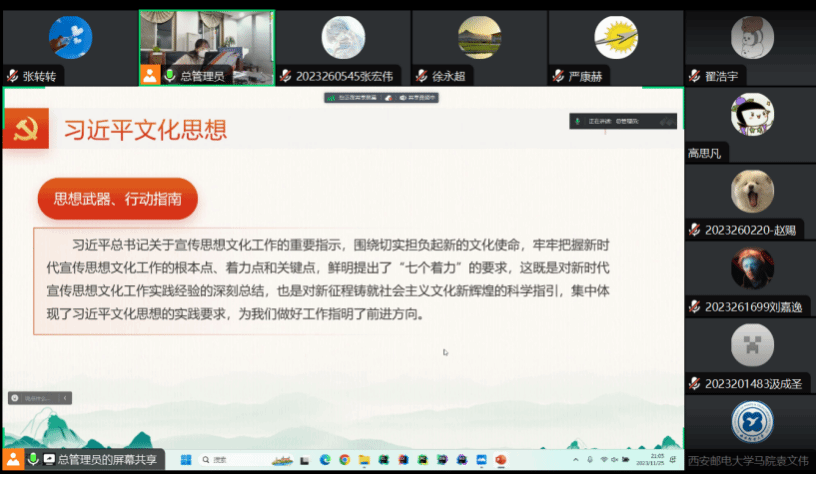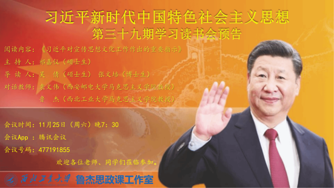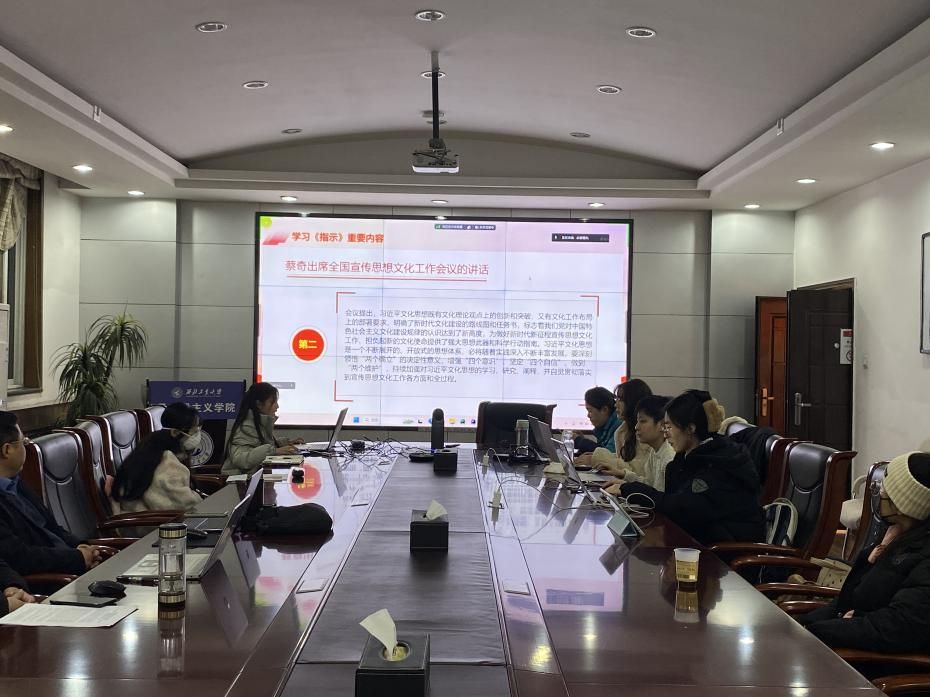 为全面学习贯彻党的二十大精神,推进习近平新时代中国特色社会主义思想进教材、进课堂、进头脑。2023年11月25日,3044am永利集团习近平新时代中国特色社会主义思想学习读书会第三十九期活动主题围绕《习近平对宣传思想文化工作作出的重要指示》进行学习研讨。本次读书会由学院思想政治教育系主任、博士生导师鲁杰教授发起,学院硕士生祁嘉仪主持,西安邮电大学3044am永利集团袁文伟教授作为对话教师应邀参加。本期读书会创新活动举办形式,首次采取线上线下相结合的方式,设置线下分会场,邀请导读同学、对话教师、硕士博士研究生在学院楼208会议室交流学习。