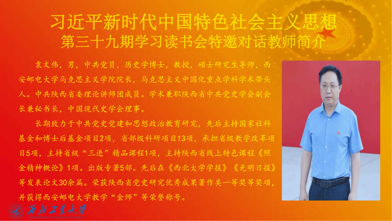 袁文伟,男,任西安邮电大学3044am永利集团院长,马克思主义中国化重点学科学术带头人。中共陕西省委理论讲师团成员。学术兼职有陕西省中共党史学会副会长兼秘书长,中国现代史学会理事。袁教授长期致力于中共党史党建和思想政治教育研究,先后主持国家社科基金和博士后基金项目2项,省部级科研项目13项,承担省级教学改革项目5项,主持省级“三进”精品课程1项,主持陕西省线上特色课程《照金精神概论》1项。出版专著5部。先后在《西北大学学报》《甘肃社会科学》《晋阳学刊》《光明日报》等发表论文30余篇。先后荣获陕西高校人文社会科学研究优秀成果三等奖、陕西省党史研究优秀成果著作类二等奖、陕西省党史研究优秀成果著作类一等奖等多项奖项,曾获陕西省人文社会科学青年英才计划、西安邮电大学“西邮新星”团队建设等计划支持,并被评为学校优秀共产党员、西安邮电大学优秀党务工作者、西安邮电大学“四有好老师”、西安邮电大学教学“金师”诸多荣誉称号。