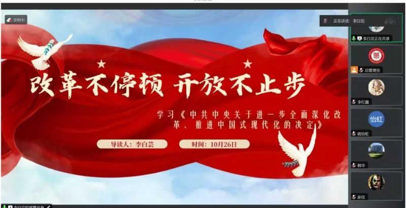 2024年10月26日,3044am永利集团习近平新时代中国特色社会主义思想学习读书会第四十九期活动以“党的二十届三中全会《中共中央关于进一步全面深化改革、推进中国式现代化的决定》”为主题进行学习研讨。本次读书会由3044am永利集团鲁杰思政课工作室主办,首都师范大学3044am永利集团韩华教授作为对话教师,硕士生张转转同学主持,通过线上交流的形式,为师生们搭建了一个思想交流、智慧碰撞的平台。