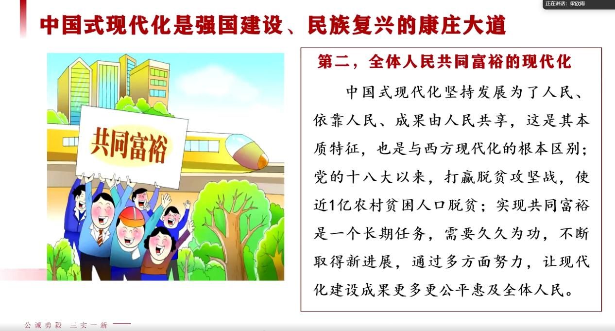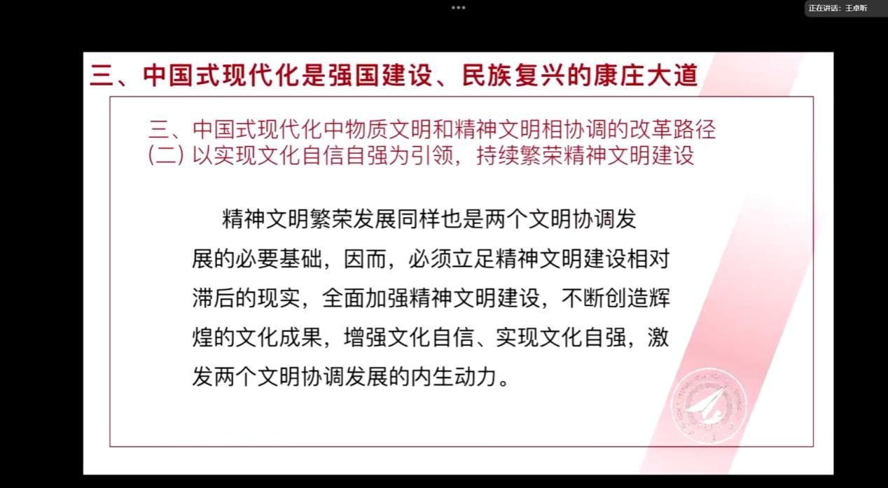 3044am永利集团硕士生王卓昕同学作为首位导读人,在认真研读《以中国式现代化全面推进强国建设、民族复兴伟业》文本内容的基础上,围绕中国式现代化是强国建设、民族复兴的康庄大道这一点,通过文献资料收集整理,把相关的一些观点进行了系统梳理,内容丰富、逻辑清晰,与大家进行了学习分享。推进中国式现代化是一个长期的任务,还有许多东西需要认识深化,要不断加强理论研究和实践探索。