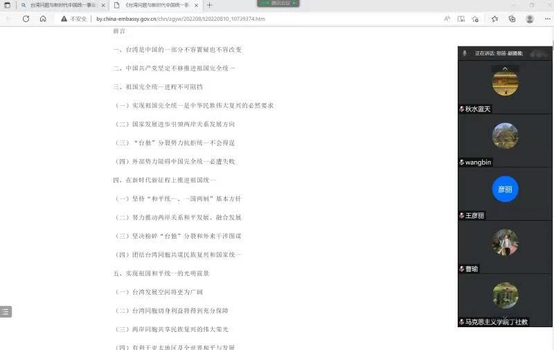 马克思主义基本原理系于8月14日,在线召开集体备课会,学习交流了关于《台湾问题与新时代中国统一事业》白皮书的理解。会议由系教学主任杨永强主持。会上张云龙副院长结合学校办学特色,阐述了将这一热点问题转化为培养学生军工报国志向的必要性与可能性;贺苗副院长从白皮书中相关表述的变化入手,列举了在课程教学中如何将其与具体知识点相结合的有效方法。其他老师根据自身的科研与教学经历,逐一分享了各自对这一文本的思考,并探讨了如何在原理课教学过程中正确回应学生对这一问题的关切、引导学生树立正确的价值观历史观等内容。通过此次集体备课,原理课课程组不仅在方向和底线两个层面就如何正确讲授这一问题达成共识,并在具体的方式方法、解读视角、特色发挥等层面就以后如何进一步处理此类具有高度舆情属性的相关问题积累了教学经验。