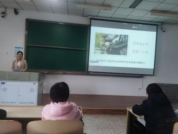 在这次思政课上,2021级硕士生李红梅同学最先和伙伴们分享了袁家村的致富故事,从袁家村厚重的产业发展历史到特色的产业发展模式,最后总结了袁家村发展面临的困境和提升袁家村民俗文化旅游的建议,特别指出乡村旅游中民俗文化是关键、一二产业是支撑、发展理念是动力。方译莹同学就第二调研地周至水街与大家分享了实践感悟。她介绍了周至水街的总体情况和发展现状,实践队在实践过程中发生的小故事,以及目前水街发展过程中所遇到的现实问题,并提出相应的对策建议。宋佳纹同学对第三个调研地西安市鄠邑区东韩村的实践情况进行了介绍,分析了东韩村在改革开放以及乡村振兴政策支持下所取得的重大成就以及发展过程中面临的问题,提出针对性的建议,最后分享了实践的切身感受。