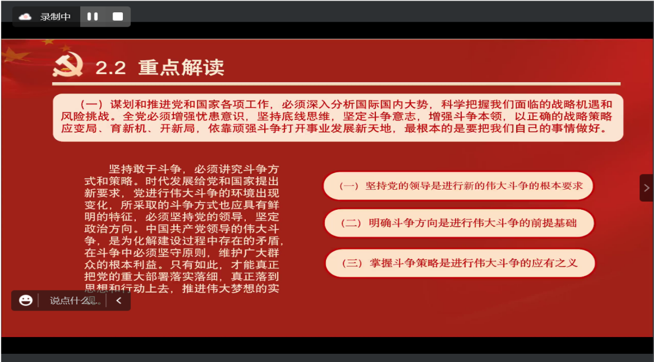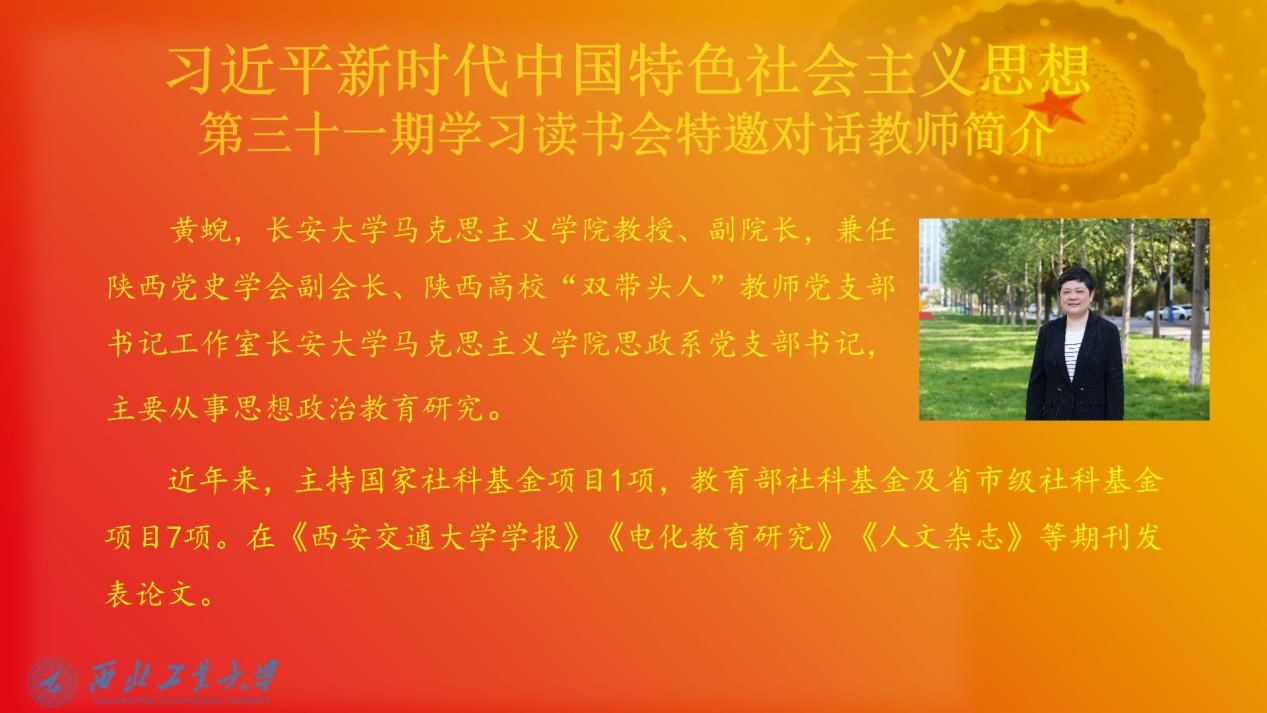 为迎接党的二十大胜利召开,推进习近平新时代中国特色社会主义思想进教材、进课堂、进头脑。2022年9月24日,3044am永利集团习近平新时代中国特色社会主义思想学习读书会第三十一期活动主题围绕《习近平在省部级主要领导干部‘学习习近平总书记重要讲话精神,迎接党的二十大’专题研讨班上发表的重要讲话》进行学习研讨。本次读书会由我院思想政治教育系主任、博士生导师鲁杰教授发起,学院硕士生蒋木子主持,长安大学3044am永利集团教授、副院长黄蜺作为对话教师应邀参加。