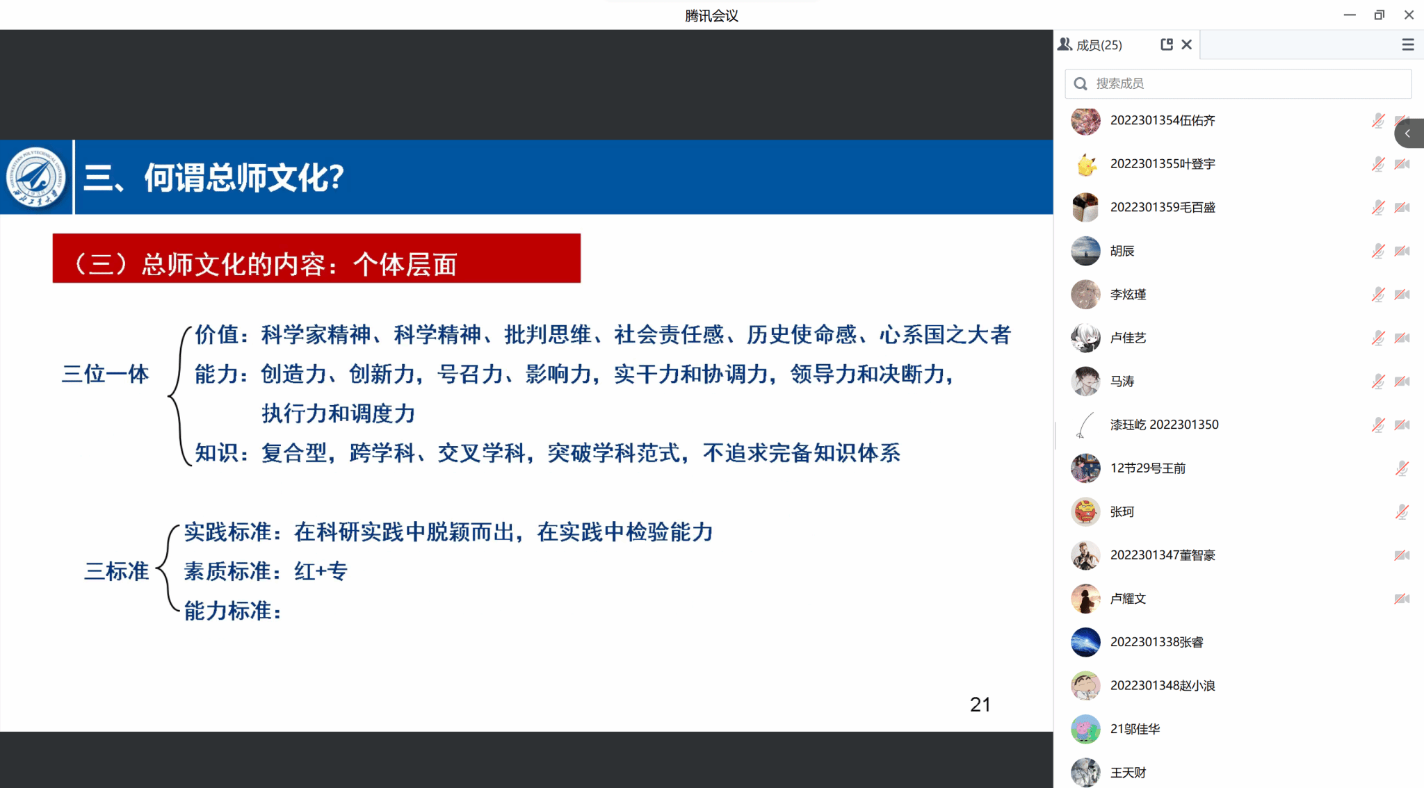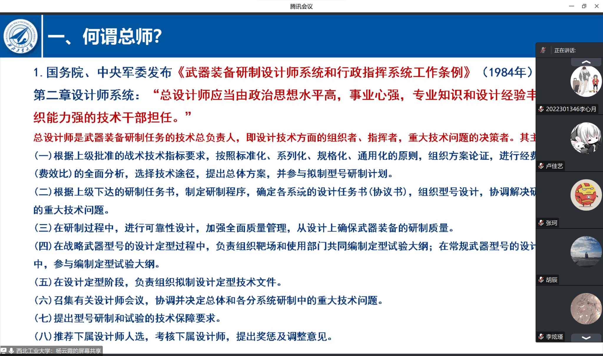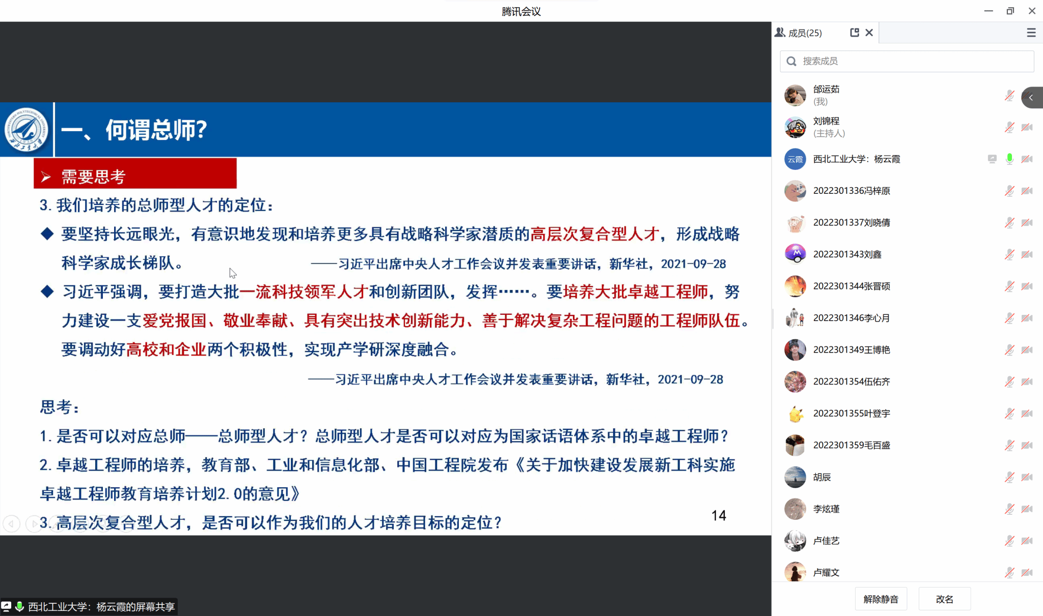 最后,杨云霞带领了解了总师型人才培养的未来趋势和要求,鼓励学生提高自身学习能力、组织能力,引导学生树立远大目标,响应国家对高层次复合型人才的需求,全面发展,提升自己各方面的能力。