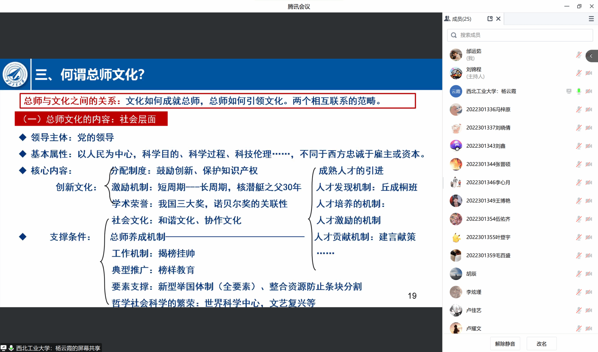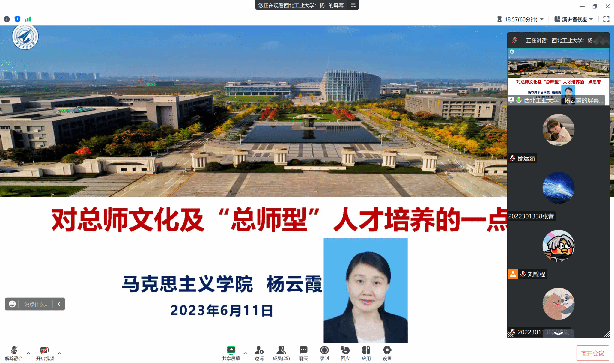 2023年6月11日上午8:30,3044am永利集团院长杨云霞为其联系的DL032207班在线讲授了主题为“对总师文化及‘总师型’人才培养的一点思考”的思政课,班级25名同学全体参与并展开了研讨。