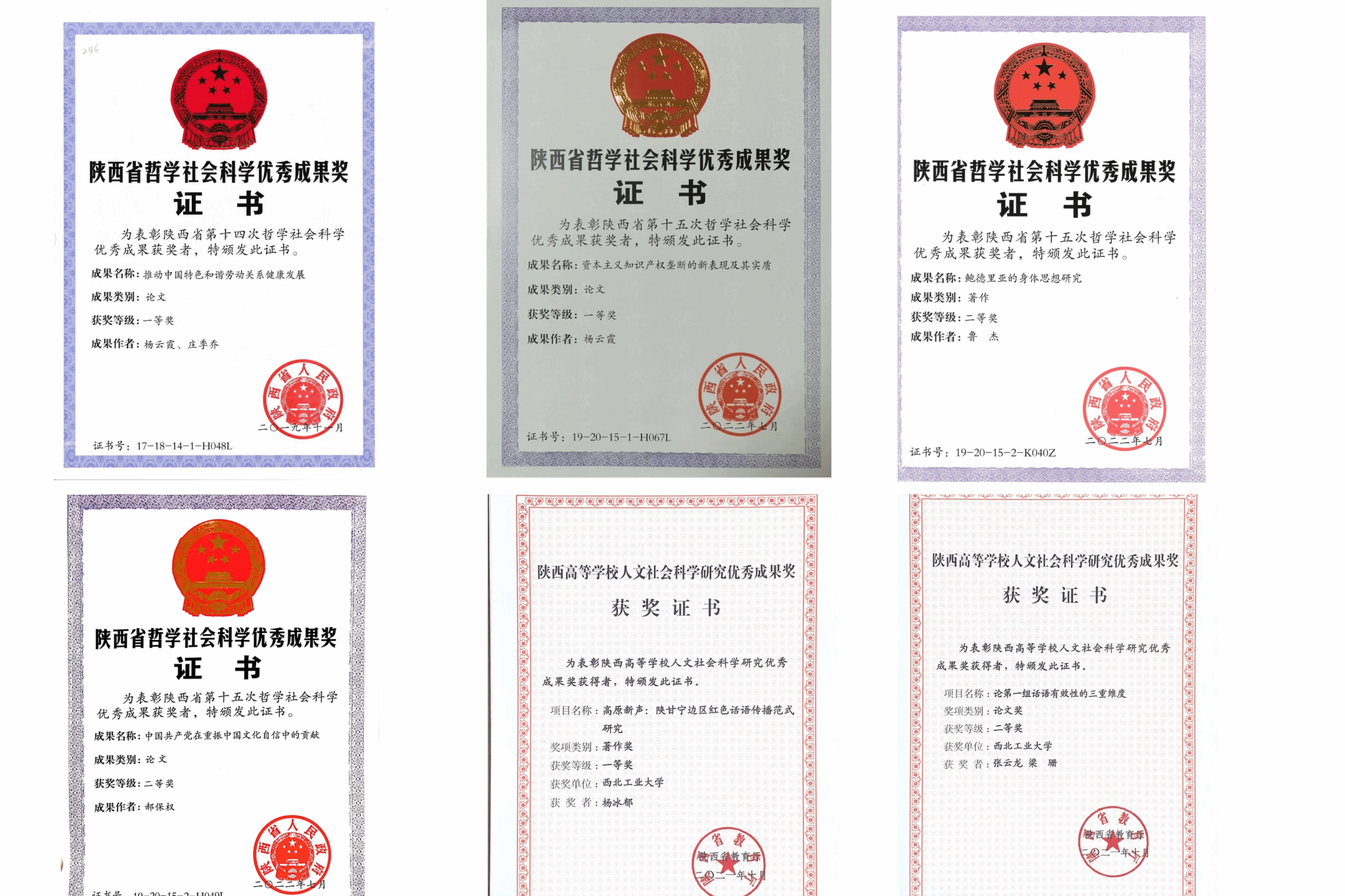 学院先后荣获陕西省哲学社会科学优秀成果奖18项,陕西省高校人文社科优秀成果奖14项。其中一等奖4项、二等奖12项、三等奖15项。杨云霞教授的《推动劳动关系和谐发展》、《资本主义知识产权垄断的新表现及其实质》、《当代霸权国家经济安全泛化及中国的应对》连续获得第十四届、第十五届、第十六届陕西省哲学社会科学成果奖一等奖;郝保权教授的《中国共产党在重振中国文化自信中的贡献》获得第十五届陕西省哲学社会科学成果奖二等奖;鲁杰教授的《鲍德里亚的身体思想研究》获得第十五届陕西省哲学社会科学成果奖二等奖;杨冰郁教授的《高原新声:陕甘宁边区红色话语传播范式研究》获得陕西高等学校人文社会科学研究优秀成果奖一等奖。学院高水平的科研成果集中展示了思政课教师严谨务实的科研态度和昂扬向上的精神风貌。