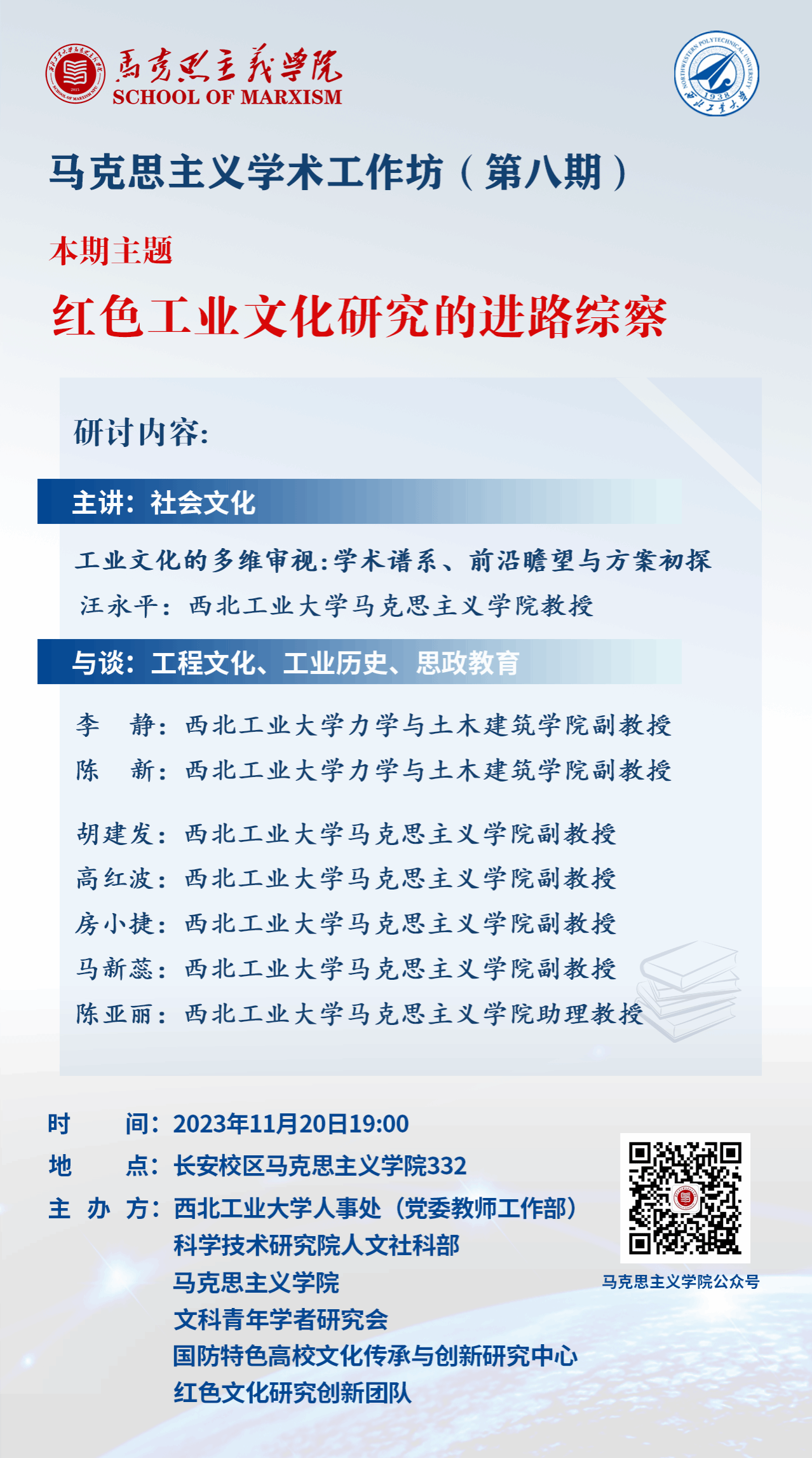 学院充分利用学术共同体凝智聚慧,与学校各部门联合开展“习近平新时代中国特色社会主义思想学习读书会”、“翱翔名家讲堂”、“人文与科技对话沙龙”等活动,不断加强思政课教师与学生的密切联系;有序开展科研团队活动,以老带新对青年教师进行帮扶和指导,创立的“当代马克思主义研究团队”被评为2023年陕西省高校创新团队;强化有组织的科研工作,将课题研讨会和学术交流会作为学术共同体的常态化工作,不断提升科研氛围,定期开展院内青年教师和学生学术活动,连续举办9期“3044am永利集团工作坊”,在校内营造良好的马克思主义理论研究氛围,并于2023年9月举办首次国际性学术论坛——第四届世界文化论坛,来自美国、英国、俄罗斯、希腊、加拿大、墨西哥等国外、国内专家学者、高校师生近200人参与了此次学术交流。