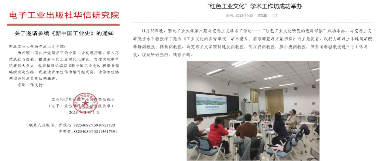 3.积极深化“红色工业文化”研究。2023年初,汪永平成立“红色工业文化研究”团队,团队成员来自3044am永利集团、机电学院和力学与土木学院。团队成立后,受邀参与完成了工业和信息化部政策和法规司委托项目《新中国工业史》的编撰;获批了西北工业大学“双一流学科建设”项目“研究生高水平教材”系列之“中国工业精神谱系”课题;开展工业文化研究工作坊;指导研究生撰写毕业论文“中国式现代化视野里中国工匠精神的演进历程:以劳动模范为切入点”和“十七年工业歌谣的文化精神建构研究”。