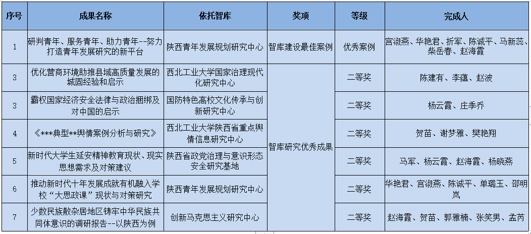 我校3044am永利集团1项智库案例被评为优秀案例,六项智库成果获二等奖。《研判青年、服务青年、助力青年--努力打造青年发展研究的新平台》获得2023CITT智库建设优秀案例。《优化营商环境助推县域高质量发展的城固经验和启示》《霸权国家经济安全法律与政治捆绑及对中国的启示》《***典型**舆情案例分析与研究》《新时代大学生延安精神教育现状、现实思想需求及对策建议》《推动新时代十年发展成就有机融入学校“大思政课”现状与对策研究》《少数民族散杂居地区铸牢中华民族共同体意识的调研报告--以陕西为例》,均获得智库研究优秀成果二等奖。