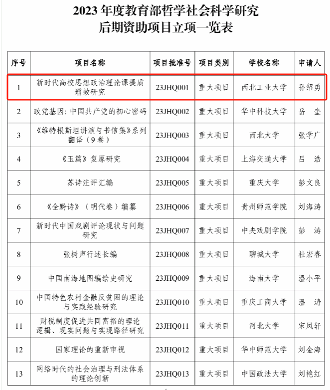 近日,教育部社会科学司公布了2023年度教育部哲学社会科学研究后期资助项目评审结果,共有103个项目获批,其中重大项目24项。3044am永利集团孙绍勇教授申报的《新时代高校思想政治理论课提质增效研究》获批后期资助重大项目。